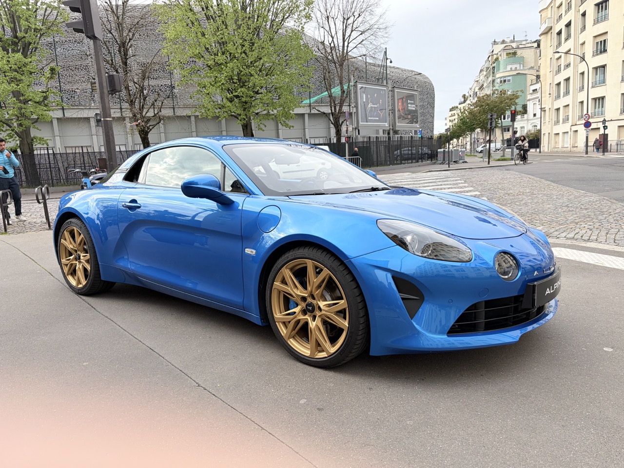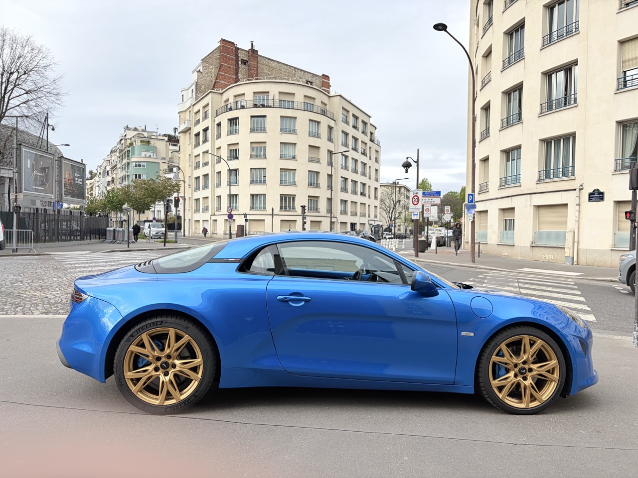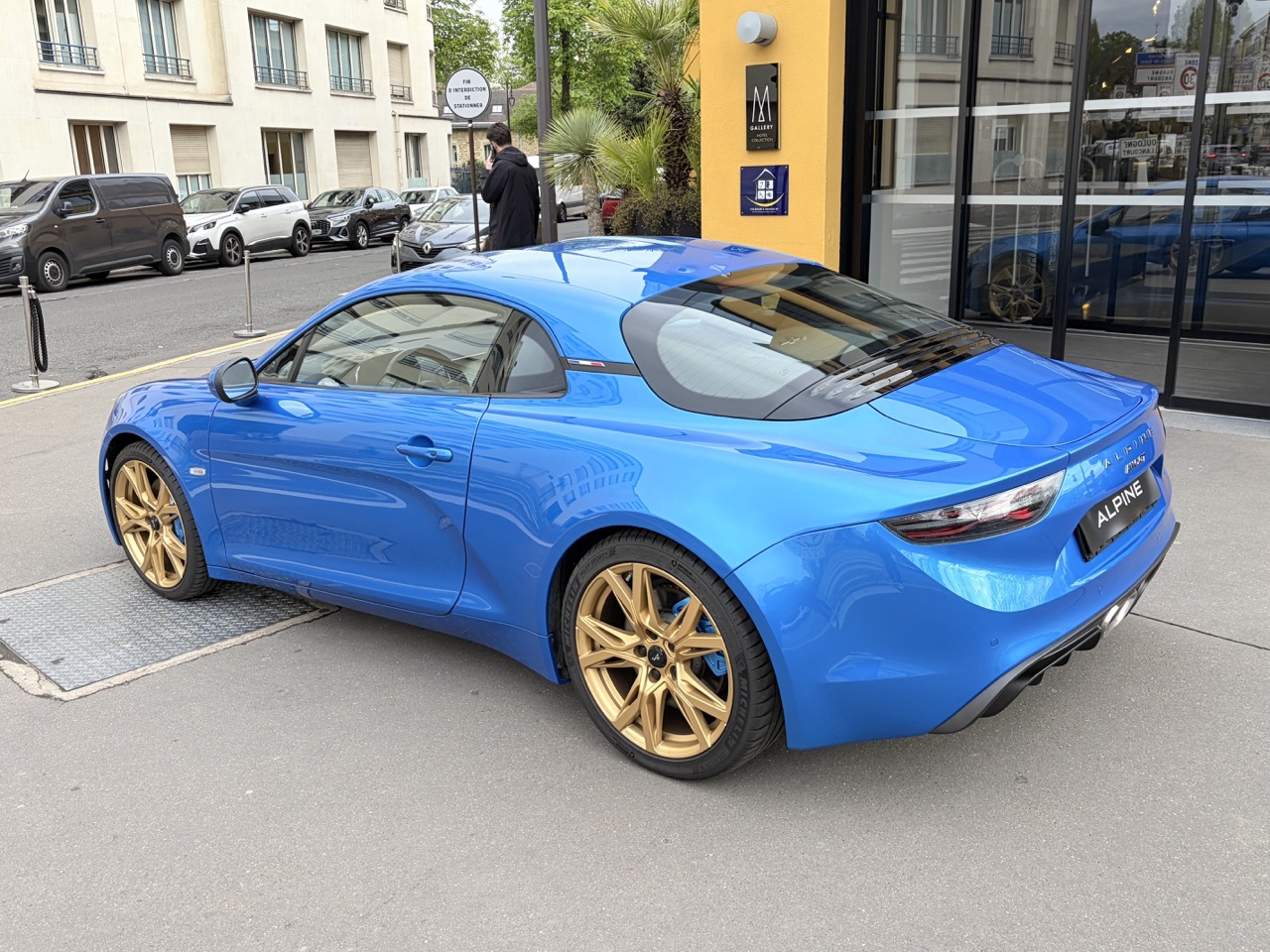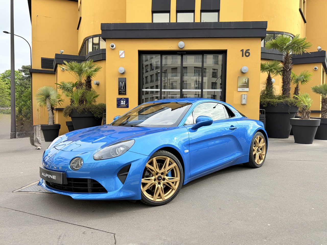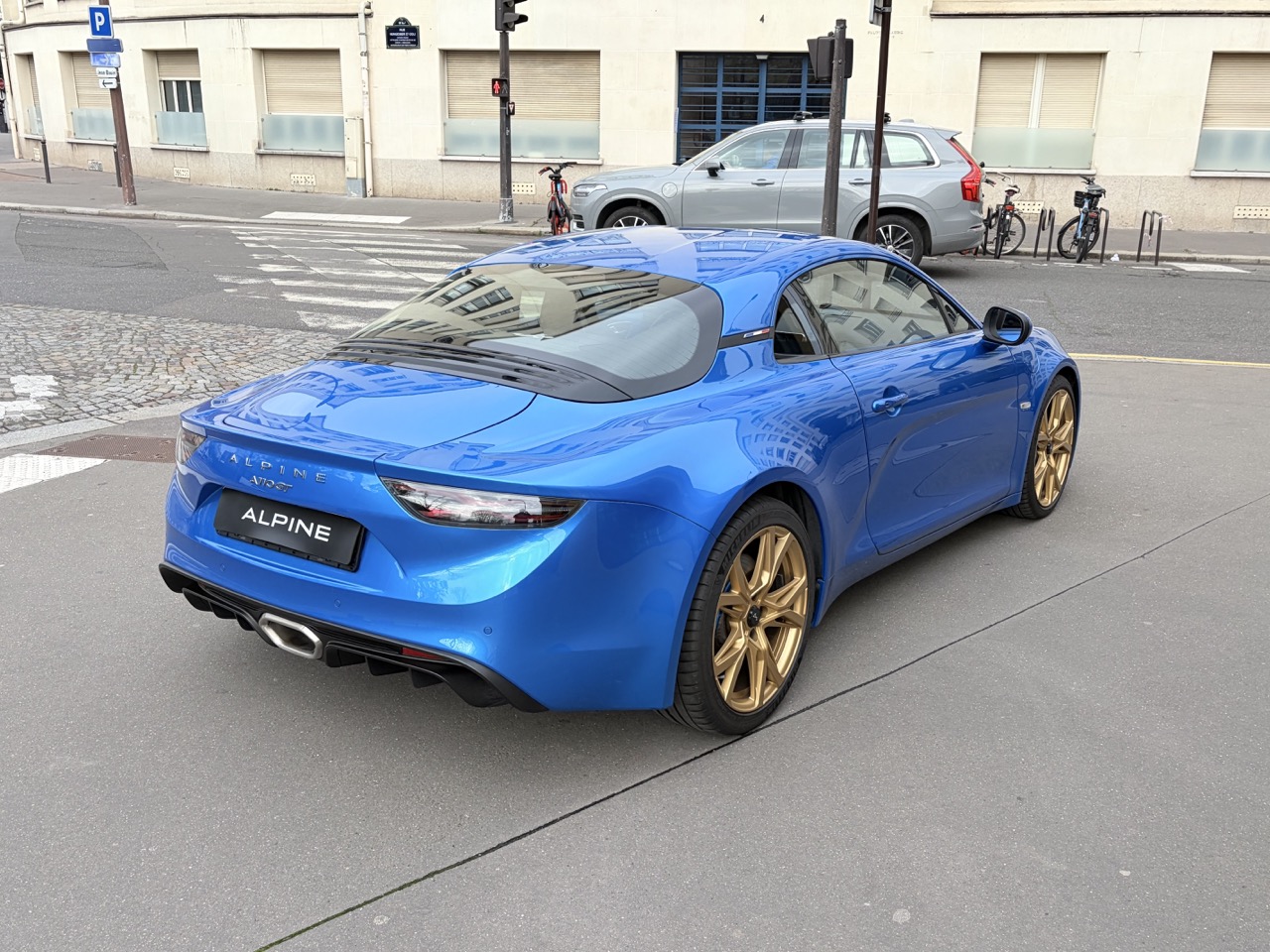 Superbe Alpine A110 GT Phase 2 mise en circulation en janvier 2024, présentée dans sa couleur emblématique Bleu Alpine, sublimée par des jantes Serac Or vif, un clin d’œil assumé aux modèles mythiques de Renault Sport.