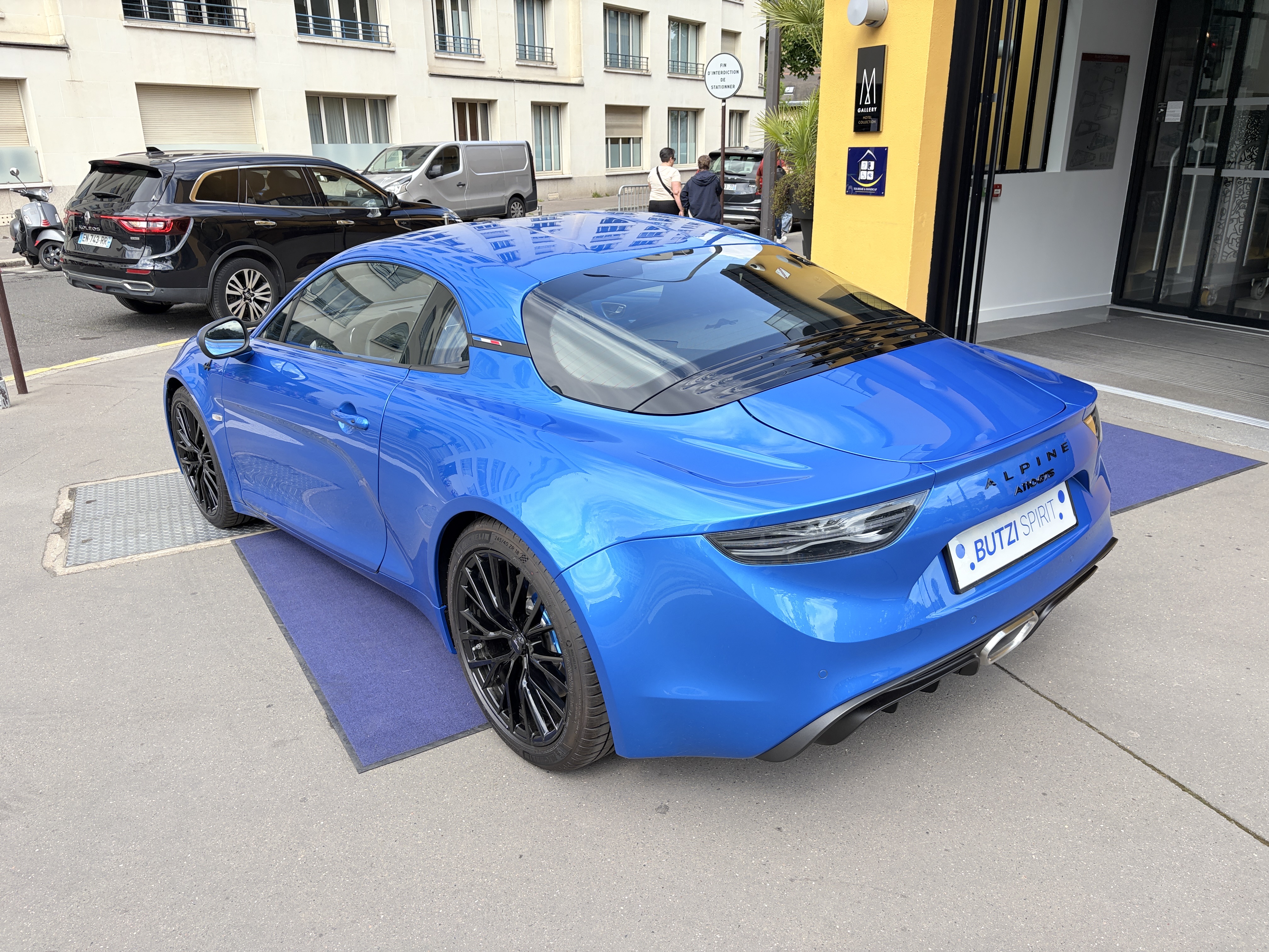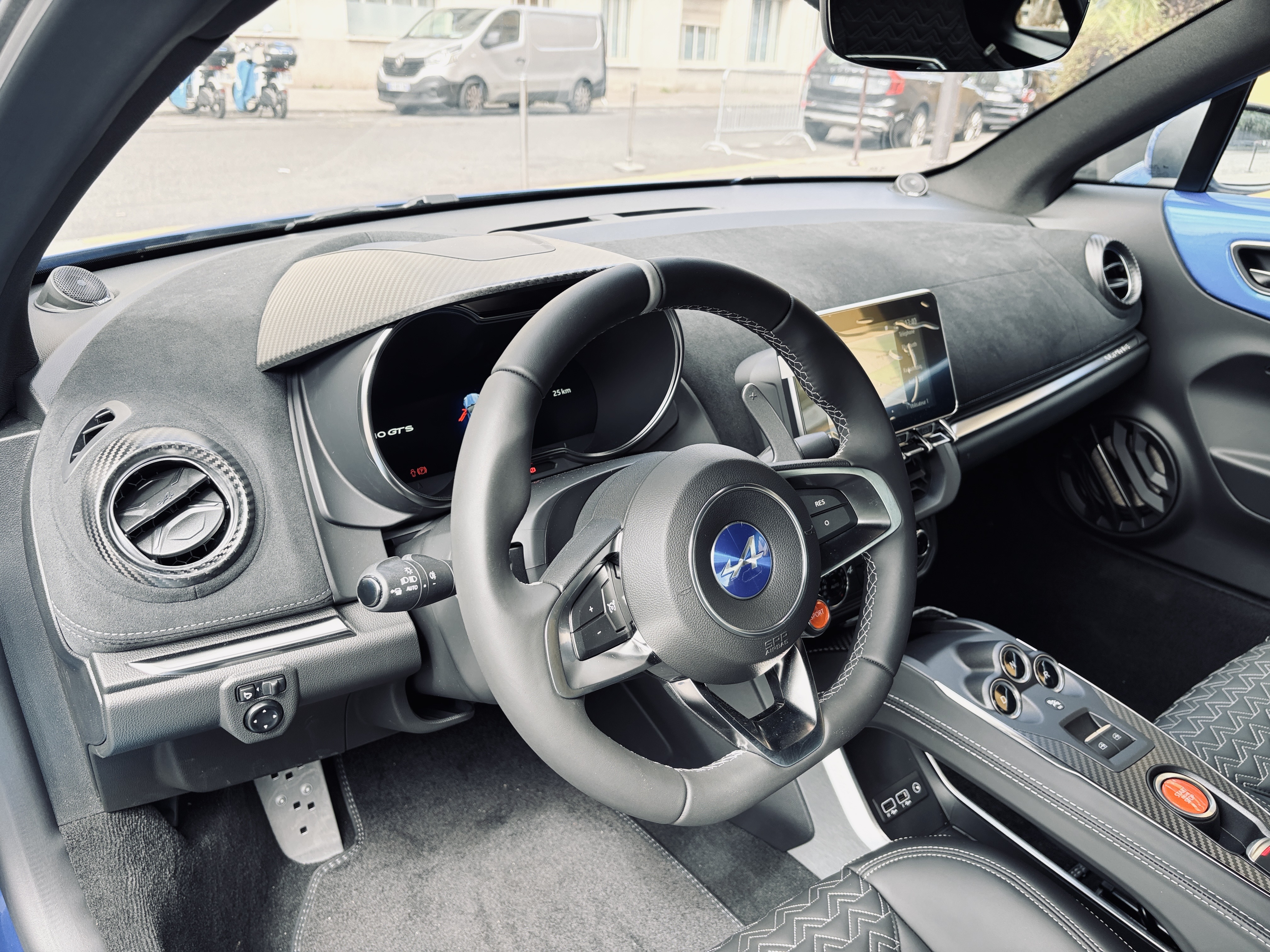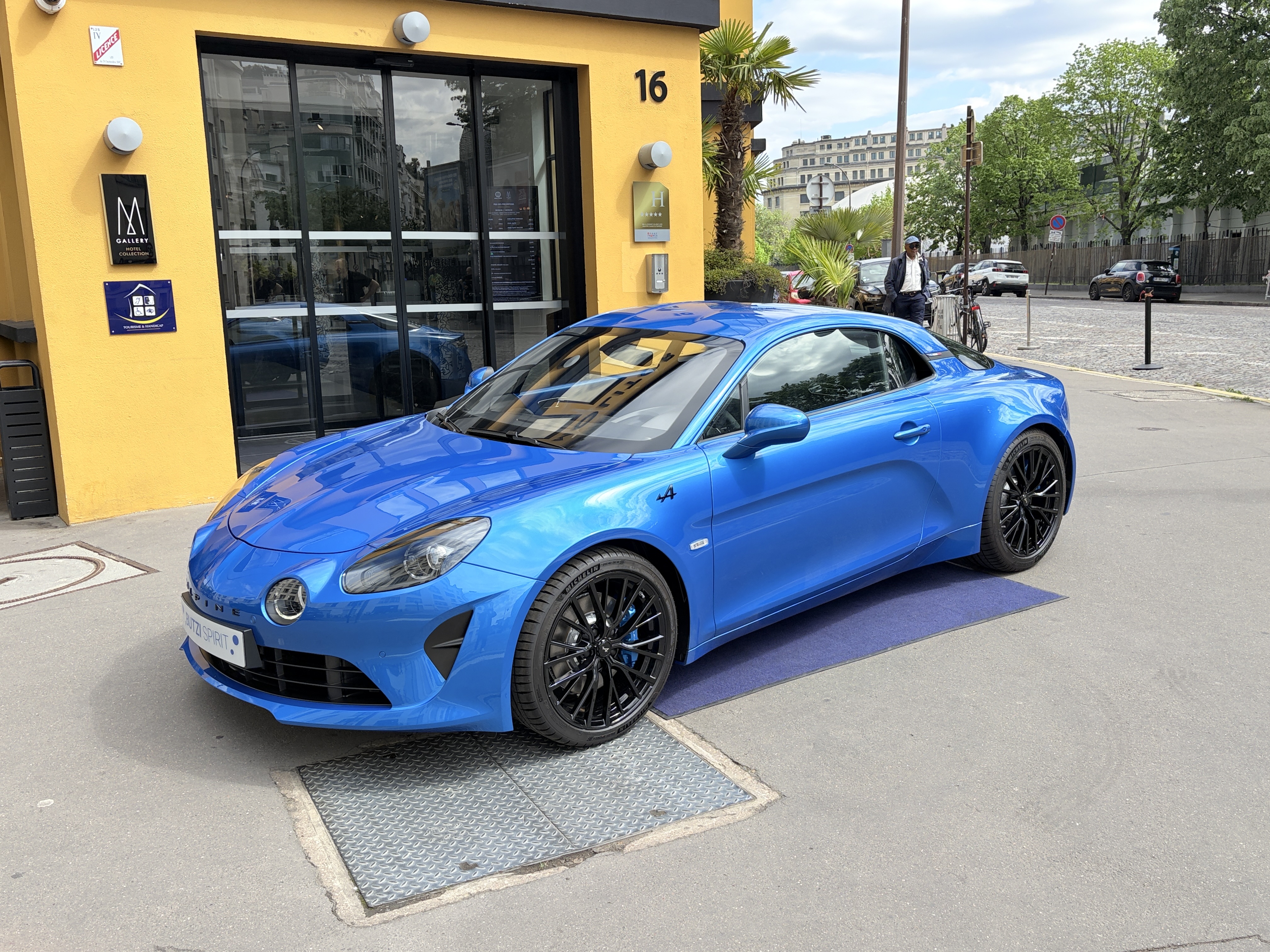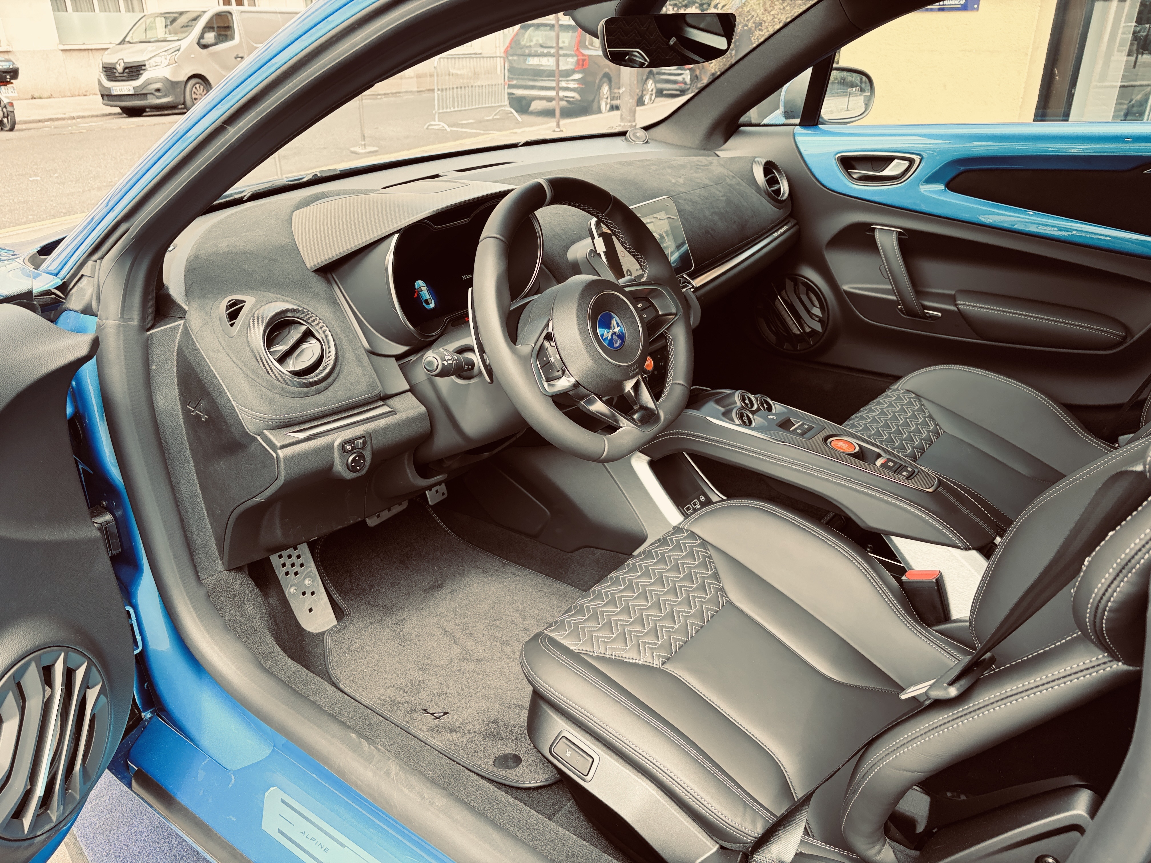 Présentée dans sa livrée iconique Bleu Alpine, elle se distingue par de nombreux rappels de teinte (étriers de freins, centre de volant, drapeaux tricolores), renforçant son caractère exclusif.