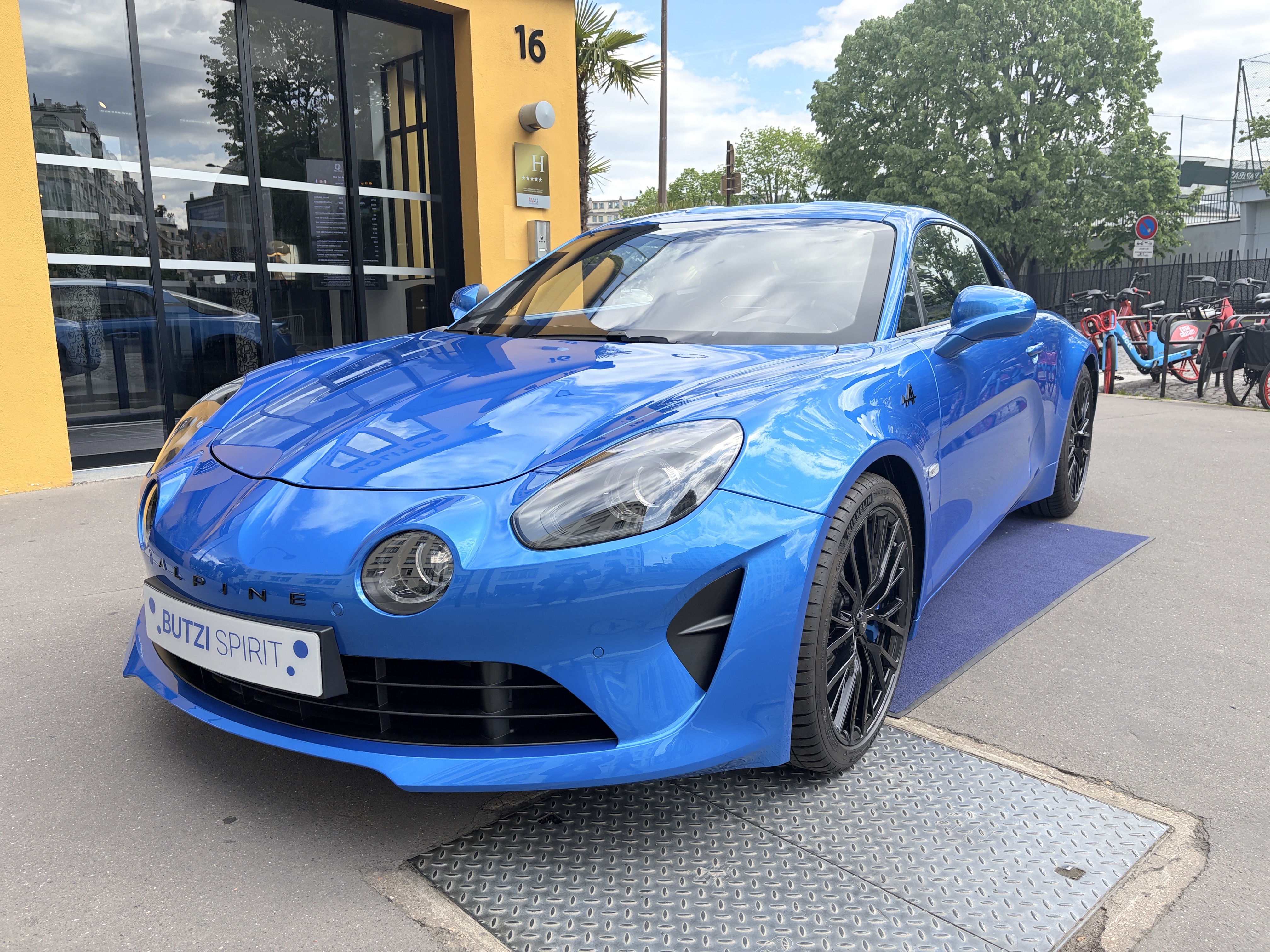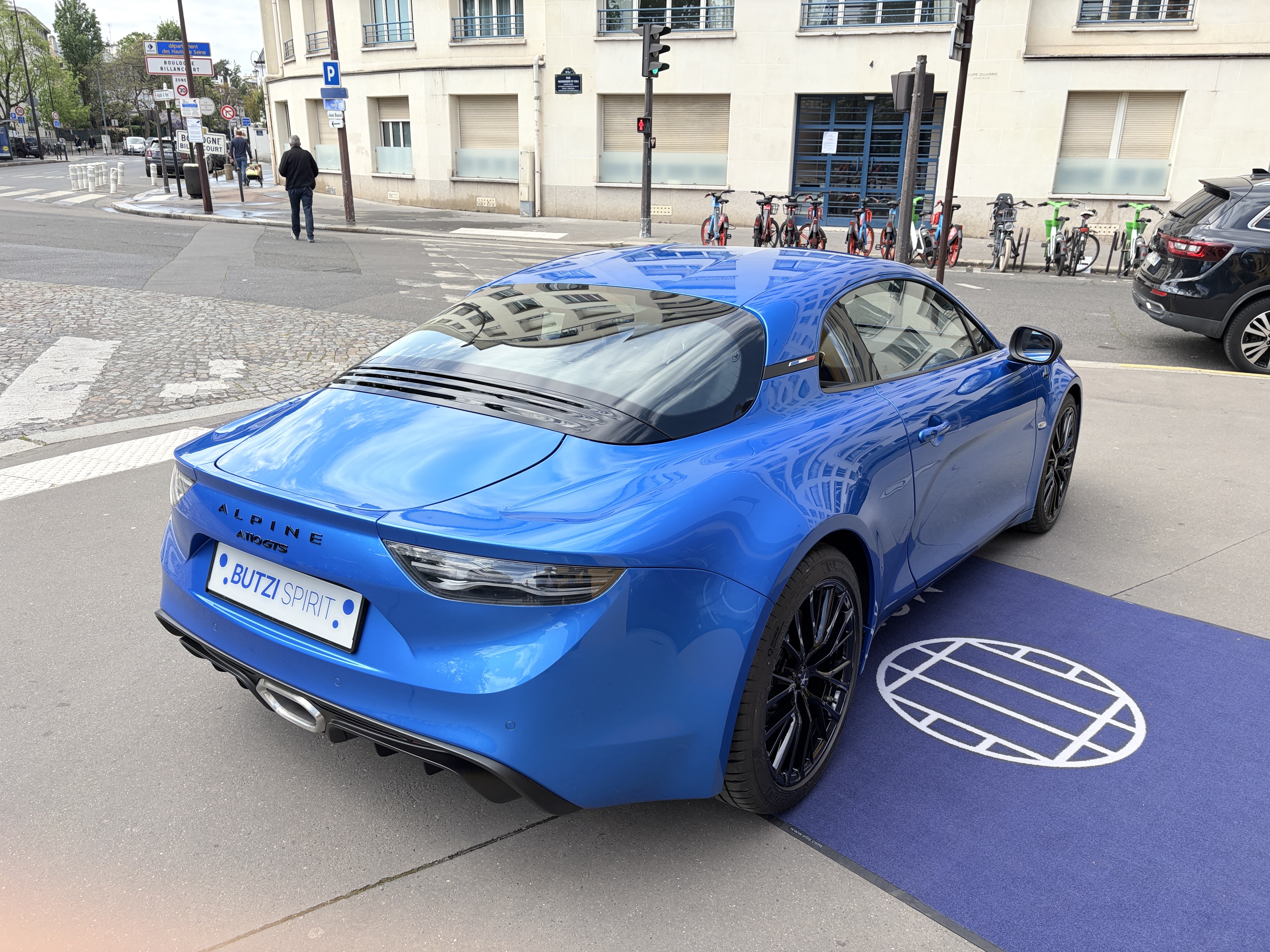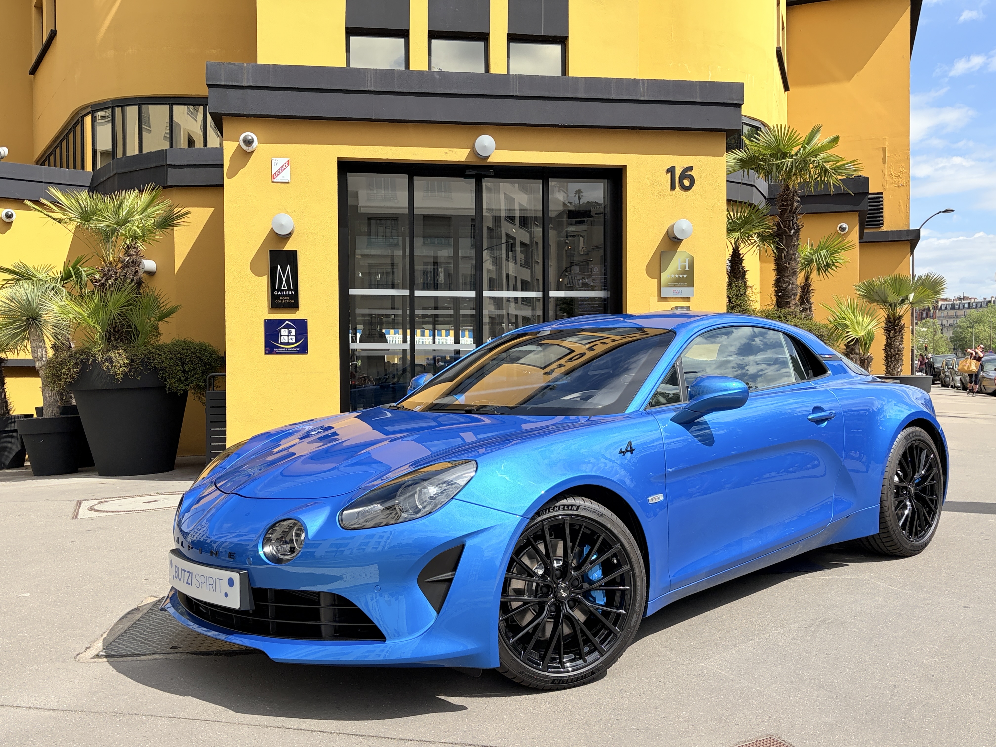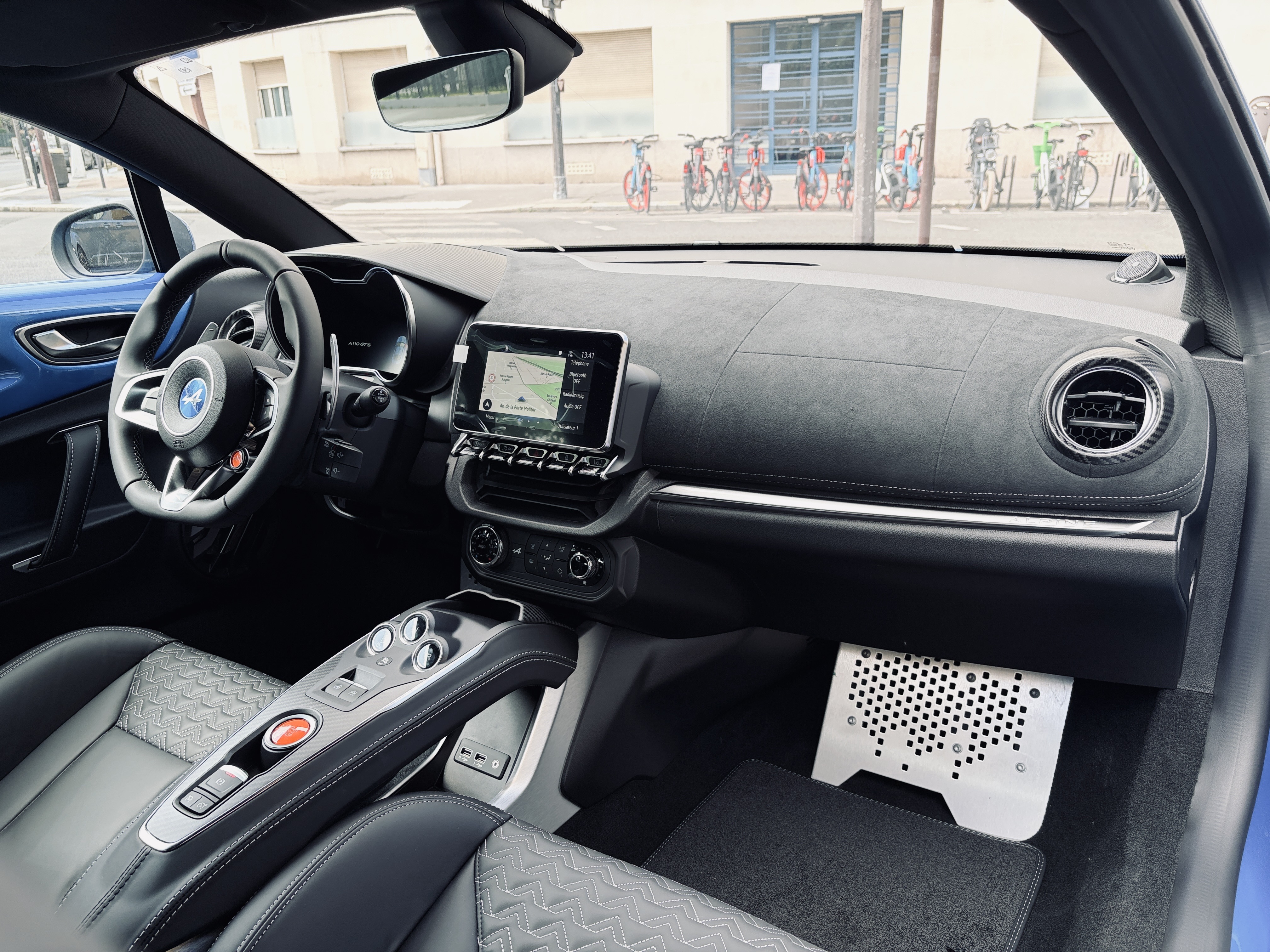 Présentée dans sa livrée iconique Bleu Alpine, elle se distingue par de nombreux rappels de teinte (étriers de freins, centre de volant, drapeaux tricolores), renforçant son caractère exclusif.