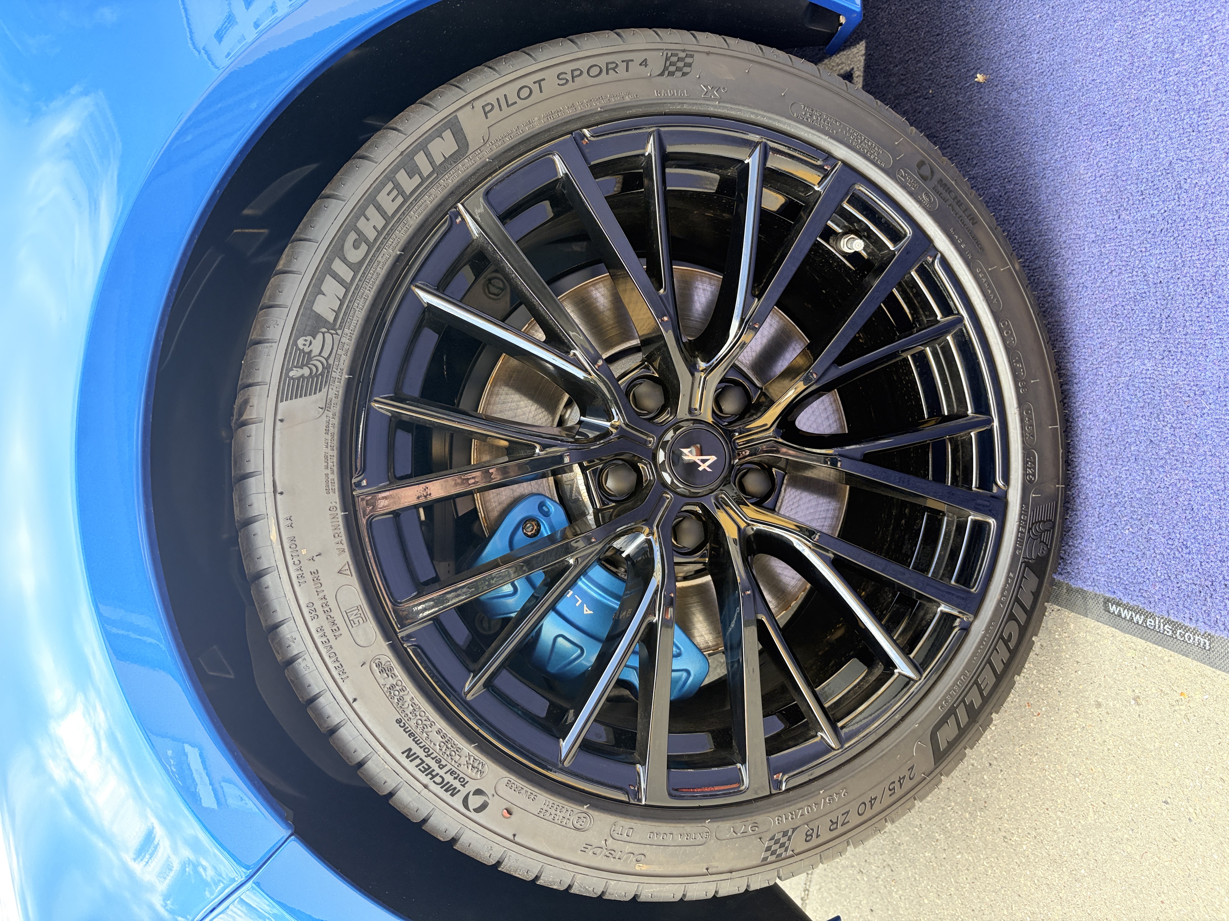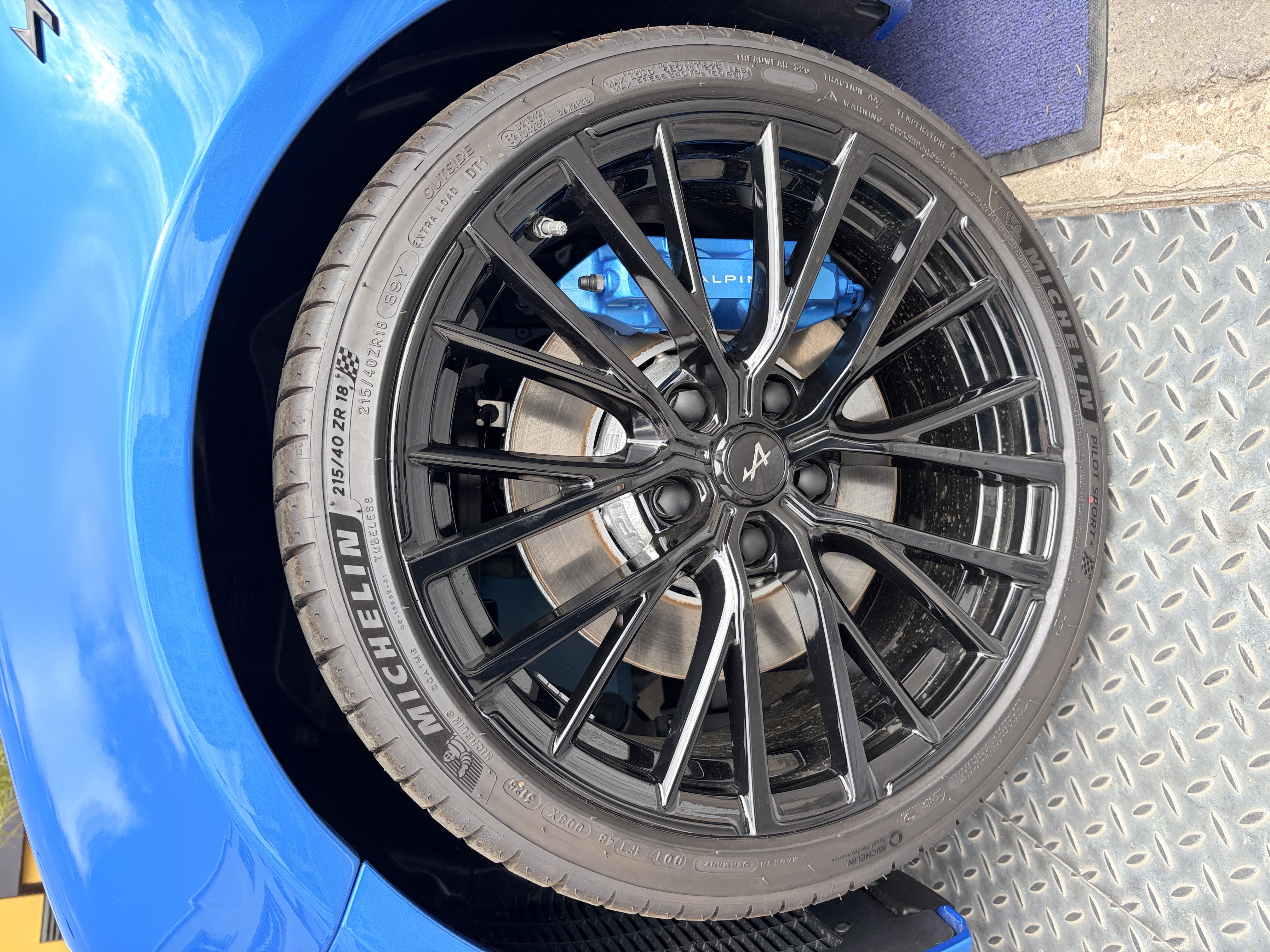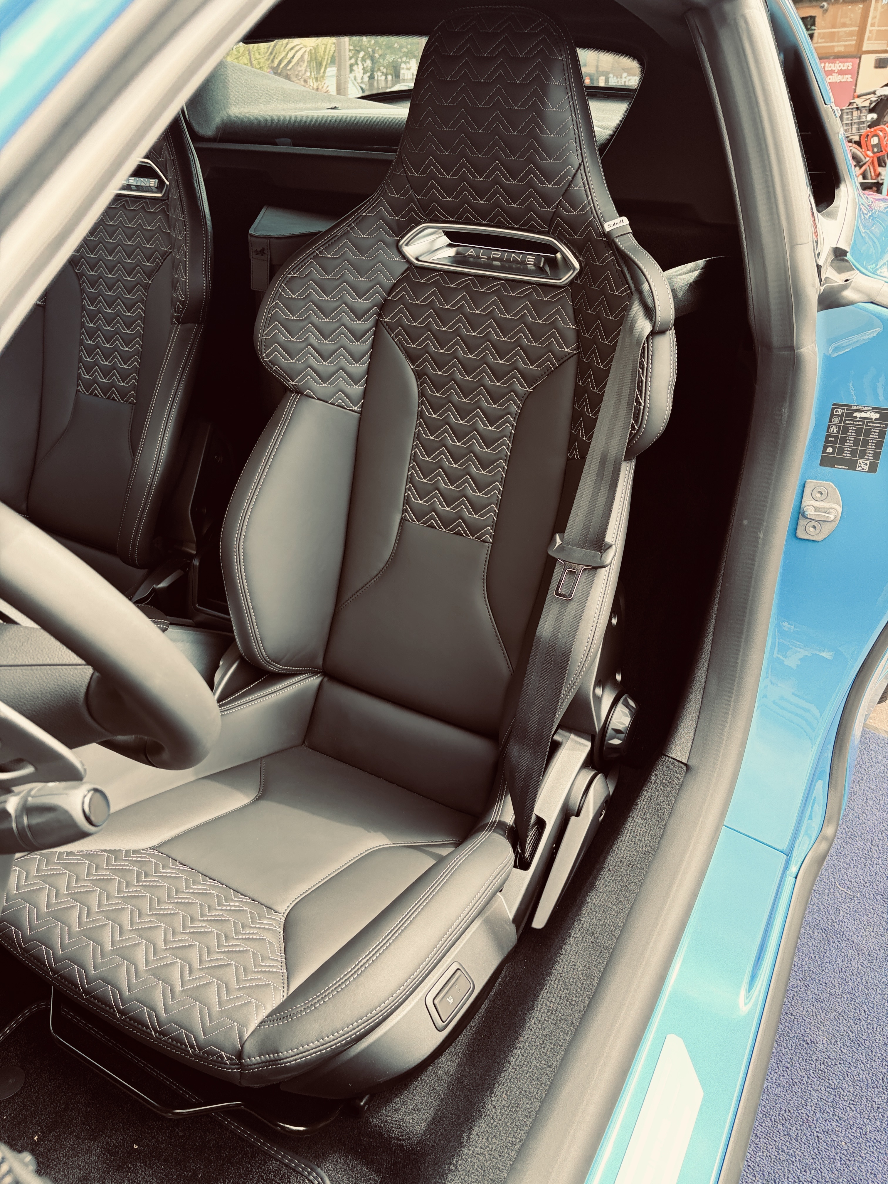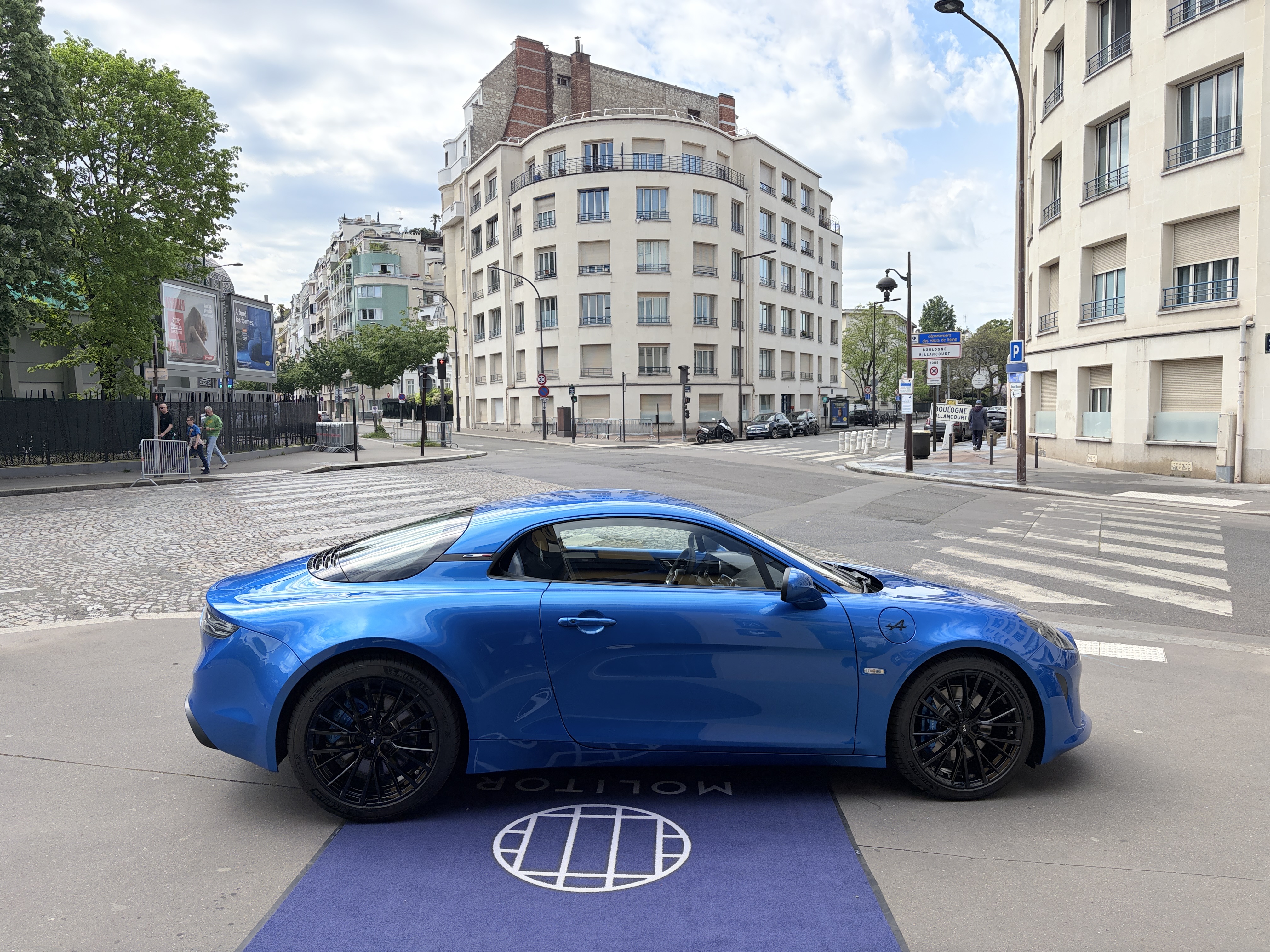 Présentée dans sa livrée iconique Bleu Alpine, elle se distingue par de nombreux rappels de teinte (étriers de freins, centre de volant, drapeaux tricolores), renforçant son caractère exclusif.